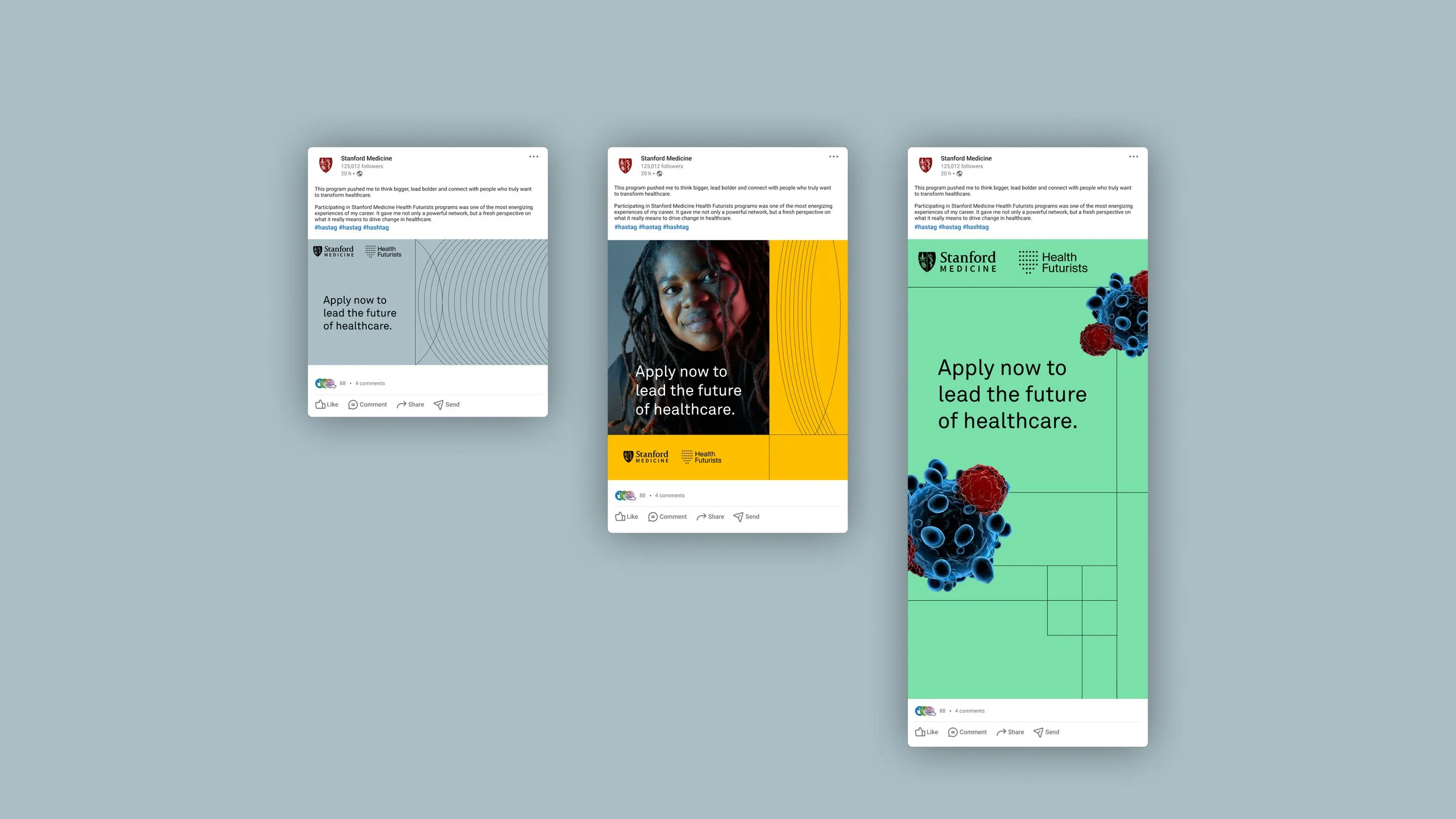The Emerging Leaders Program (ELP) is an 8-week hybrid program from Stanford Medicine designed to equip mid-career healthcare professionals with the skills and insights needed to step into broader leadership roles. We created a set of LinkedIn ads to promote Stanford Medicine’s Emerging Leaders Program (ELP), repurposing existing brand assets to ensure alignment with their established visual identity.