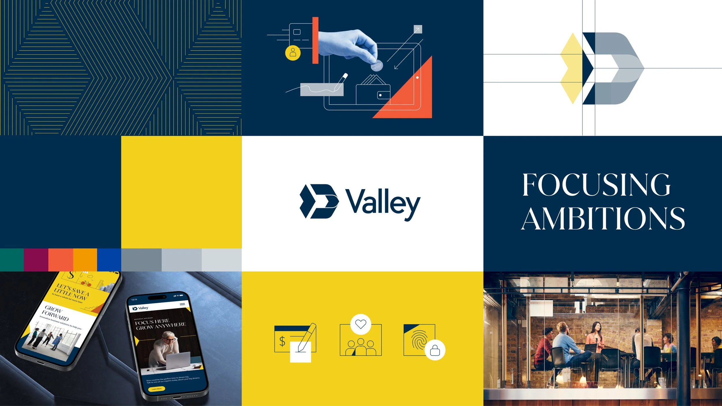 Valley Bank partnered with Monigle to evolve from a community-focused retail bank into a commercial bank built for growth. While preserving their logo and primary color palette, we transformed the mark into a dynamic device, elevated photography, and developed a sophisticated illustration system. Drawing on the focal point of the logo symbol, our graphic motif reinforces a bold and ambitious vision for business and legacy.