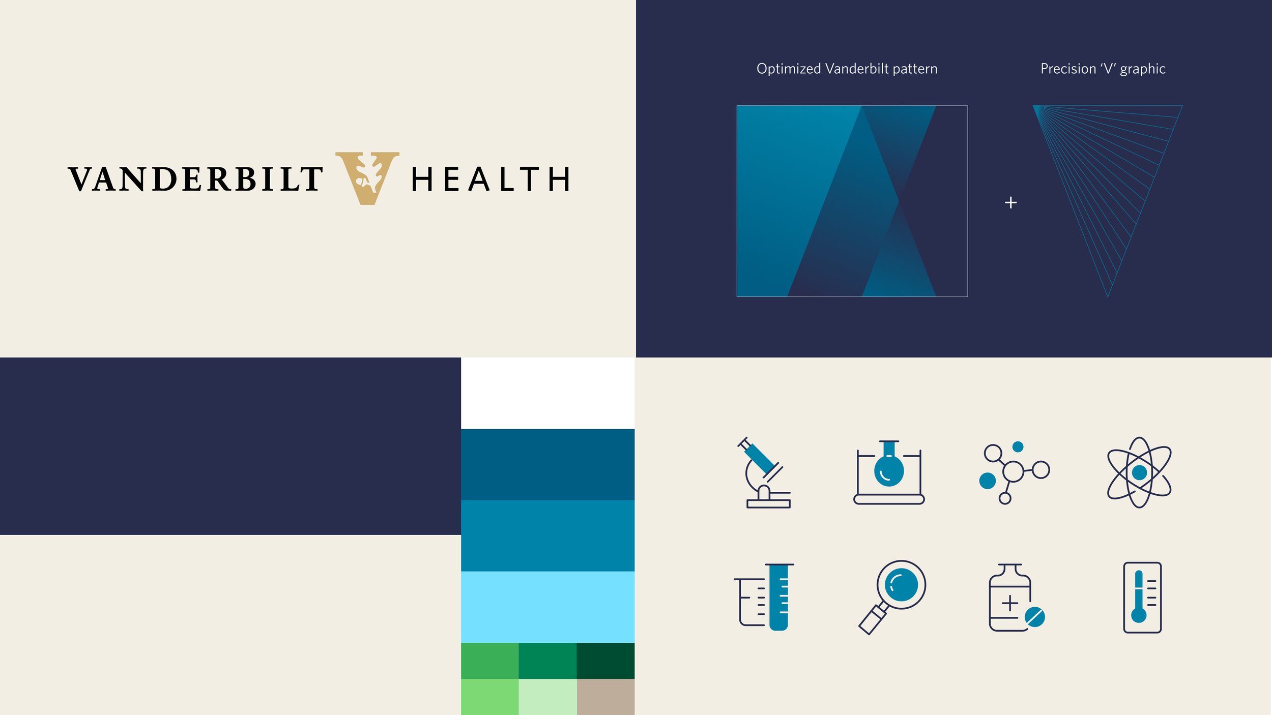 Vanderbilt Health is the Southeast’s most comprehensive health system, with a vision to lead in advancing personal health and a mission to deliver a personalized patient experience with care and expertise. The refreshed visual identity centers on a “V” pattern inspired by a DNA strand, symbolizing both personalization and precision in care. Designed to evoke confidence and expertise, the identity builds on the existing brand to support growth, enhance recognition, and differentiate Vanderbilt Health from competitors and Vanderbilt University.